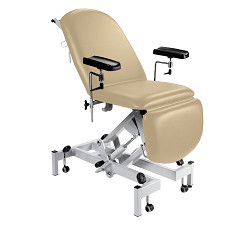 Sunflower Fusion Phlebotomy Chair. Featuring Hydraulic Height Adjustment and gas-assisted head and foot sections.FeaturesElectric or Hydraulic height adjustmentMaximum user weight 250kg (40st.)Gas strut head and foot sectionsElectric head section and foot sections adjustment option (Sun-FPHBE2 & 3)2 Fully adjustable phlebotomy arms as standard50mm Retractable positioning castorsAdjustable height levelling footDual sided foot pedals (Hydraulic models only)Fully upholstered head and foot sectionsHoist clearance 13cmDouble layer density foam for support and comfortLuxury 65mm deep contoured upholsteryAnti bacterial/anti-microbial additive helping reduce MRSA and other bacteriaPaper roll holder (supplied as standard)Easy clean design and materialsCE marked* 5 year product warranty covers failure of all mechanical parts during normal use** 15 year frame guarantee covers mechanical failure of the frame during normal use within a 15 year life span