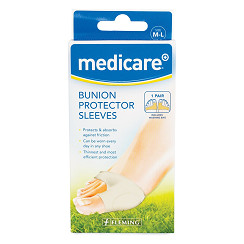 Medicare Bunion Protector Sleeves provide discreet relief and protection for painful bunions. With superior cushioning that provides instant and all day relief from rubbing and pressure on painful bunions. The thin and light protector sleeve material makes them comfortable to wear with any shoe type.FEATURES:¥ Size: Medium to Large¥ Protects and absorbs against friction¥ Can be worn every day in any shoe¥ Thinnest and most efficient protectionSIZE: Medium to Large (8.6 x 9.9cm). May be worn on either right or left foot. If you are unsure between two sizes, choose the smaller one.DIRECTIONS: Ensure that feet are clean and dry. Place the protector loop over the big toe, ensuring the gel pad protector fits comfortably over the tender area.CARE INSTRUCTIONS: Machine washable. Hand-wash with a neutral detergent in 30¼ water. Rinse and leave to air dry. Reusable for several months.CAUTION: Keep out of reach of children. Do not use on broken or irritated skin. If you suffer from diabetes or poor circulation, consult a doctor before use. Store in a cool, dry place out of direct sunlight.COMPOSITION: 61% Polyamide/Elastane Fabric, 39% Silicone.