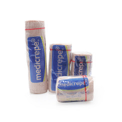 Elastic support bandage to be used on intact skin (medical device). Medicrepe Elastic Support Bandage for the first aid treatment of emergency injuries, sprains, strains and in other conditions in which light support is required. The Medicrepe Elastic Support Bandage comes with special clips to secure the bandage once a desirable level of compression has been achieved. Due to the high quality of fabric, there is superb elasticity. In the case that some elasticity might be lost during use, it will be restored again after washing in warm soapy water. The bandage is very durable and versatile and can be washed easily.FEATURES:¥ Comfortable soft lightweight bandage¥ Skin friendly¥ Washable and reusable¥ Individually wrapped with clips¥ Size: 6cm x 5m (stretched)¥ For emergency aid treatment of sports and workplace accidents¥ To support and immobilise the arm or leg following injuries¥ To secure and compress dressings in place over open wounds¥ Offers a medium level of compression Warning: do not apply with too much tension, Bandage clips are not to be applied on patients. Material composition approx. 64% cotton, 35% polyamide, 1% elastane. Please wash with similar colours.