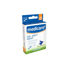 The Medicare Gel Arch Wrap is designed to provide targeted relief for those suffering from foot discomfort, including plantar fasciitis, flat arches, and cavus foot. The shock-absorbing Biogel reduces pressure and alleviates pain by supporting the arch. The wrap is made with soft, breathable fabric for comfort and includes mineral oils and skin-care ingredients to moisturise the skin.SIZE: Large to Extra Large sizing is suitable for a foot length of 26cm to 28cm.INSTRUCTIONS FOR USE: Wear the product as shown in the picture. Remove and hand wash with warm water, then air dry in a cool place.MATERIAL COMPOSITION: Fabric: TOK (Velcro Plush), 1mm black ECO-SPONGE, HPL (Polyester Jersey). Lining: Medical-grade bio-gel.CAUTION: Please keep out of reach of children. Do not use this product if you are allergic to any of its ingredients. Do not use on broken or inflamed skin. If you have diabetes, consult your doctor before use. Discontinue use and consult a doctor if you experience a rash, hives, itching, or any irritation. Store in a dry place and avoid direct sunlight.