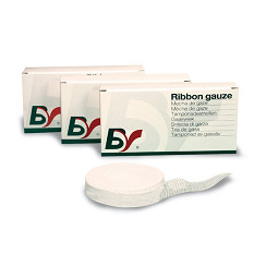 ¥ 100% Cotton Sterile Ribbon Gauze¥ 22 thread/sq.cm¥ Size: 5cm x 5m¥ 26 Pcs per Pack