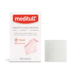 Meditull Parafin Gauze Dressing consists of a leno-weave fabric of 100% absorbent cotton thread, impregnated with white soft paraffin and is used as a primary wound contact layer.¥ The dressing and the paraffin reduce the adherence of the product to the surface of a granulating wound¥ Size: 5 x 5cm¥ 10 Pcs per PackMeditull Parafin Gauze Dressing consists of a leno-weave fabric of 100% absorbent cotton thread, impregnated with white soft paraffin and is used as a primary wound contact layer. The dressing and the paraffin helps to reduce the adherence of the product to the surface of a granulating wound.