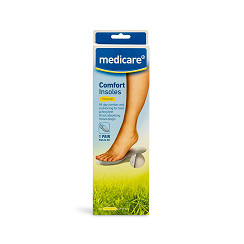 Medicare Comfort Insoles (1 Pair per Pack)Medicare Comfort Insoles provide every day comfort and cushioning for tired feet.¥ Every day comfort and cushioning for tired feet¥ Extra grip in footwear¥ Soft foam material for extra comfort¥ Full length- can be cut to suit all foot sizes¥ 2 Pcs/1 Pair per PackRelieve the pressure caused by sore heels, heel spurs and other similar conditions. Made from a specially developed foam with excellent shock-absorbing properties, our heel cushions gently lift and cradle your heel giving you welcome comfort and relief.These every-day comfort insoles are ideal for helping to reduce pain and discomfort caused by podiatry problems and conditions such as arthritis, weak arches and ball of foot pain. These comfort insoles are excellent for the prevention and treatment of sports injuries such as shin splints, runner's knee, jumper's knee, ilio tibial band friction syndrome, medial tibial stress syndrome, tibial stress fractures and bone stress reactions, as well as osteoarthritis of the hip joint and knee joint.Our extensive range of insoles provide both comfort and biomechanical functionality. Specific foot support functions available in selected products include:Product Features: ¥arch supports¥improved instep comfort¥correction for pronation and over pronation¥extra heel cushioningSome of these foot supports are suitable for athletes, sports players, runners and serious walkers, where cushioning against the effects of repeated high-impact shock is particularly relevant. Orthotics can be very effective in the treatment of plantar fasciitis, flat feet, ball of foot pain, heel pain, outside knee and hip pain and pronation. Highly durable, washable and comfortable to wear all orthotics are supplied in pairs to avoid problems caused by limb length discrepancies.The extensive Medicare Foot Care range has been scientifically developed with your comfort in mind: from Bunion pads to Heel cushions, from Toe Splints to Flight Socks: whatever your feet need, we have the solution.
