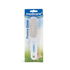 ¥ The Medicare Pumice Stone with Handle is designed to gently reduce and smooth roughened skin¥ Convenient handle allows for easier movement of stone¥ Ensure feet are clean¥ You can use a pumice stone on wet or dry skin but for best results softent the skin by soaking in warm water¥ Hold the pumice stone by the handle and use a soft, circular motion to gently buff away the dry skin¥ Suitable for use on feet, knees and elbows¥ After use, wash the pumice stone with warm water and leave to dry naturally¥ Stop using if skin becomes sore or inflamed¥ Do not use on broken or irritated skin¥ People with Diabetes or poor circulation should consult with their doctor before using this productMedicare Pumice Stone with Handle is designed to gently reduce and smooth roughened skin. The pumice Ð a small block of lightweight, hardened lava foam Ð sloughs off tough, dry skin and dead skin cells, from the feet. A pumice can also be used gently on hardened skin at the elbows and knees. Regular use of a pumice stone improves the appearance of the skin and relieves discomfort caused by calluses. The convenient handle is designed for easier use of the stone. It's a good idea to apply some moisturizing lotion to your feet, following exfoliation with the Pumice Stone. This will help keep the skin pliable and prevent cracking skin and fissures. Put your best foot forward and use with Medicare Cracked Heel Foot Cream to soften and exfoliate rough, dry and cracked heels. Give your feet the perfect finishing touch with Medicare Smoothing Foot Scrub, a highly effective foot scrub that helps remove dry, rough or hardened skin while softening and exfoliating the skin. The extensive Medicare Foot Care range has been scientifically developed with your comfort in mind: from Bunion pads to Heel cushions, from Toe Splints to Flight Socks: whatever your feet need, we have the solution.
