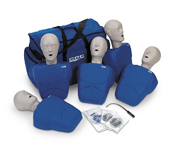 Comprehensive design allows for practice of Heimlich maneuver and abdominal thrusts, as well as CPR and mouth-to-mouth breathing. Realistic anatomical markings (Adam?s apple, carotid arteries, navel, rib cage, chest notch) make it easy to learn correct hand placement for checking pulse, performing chest compressions, and more.Provides valuable student feedback and other important features:? Head tilt/chin lift required to open airway? Proper anatomical landmarks? Audible compression ?clicker? to ensure proper technique.Ideal for group training - allows each student to have their own manikin for maximum practice time. Easy-to-clean heads are dishwasher safe and can easily be sanitized. Lung bags are replaceable. Designed to meet American Heart Association criteria for desirable manikin features. With age selector dial that adjusts chest compression piston for learning adult or child techniques. Each set is packed in a rugged nylon carrying case with a supply of 50 face-shield lung bags and an insertion tool. 5 ADULT/CHILD MANIKINS50 FACE SHIELDS & CARRY CASE