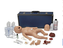 Newborn size: 19 in. L (crown to heel), 7-1/2-lb. weight, 14-1/2 in. head circumferenceIncludes simulator, replaceable airway (2), bilateral lung, collapsed lung, functional (patent) umbilicus, omphalocele, myelomeningocele, hand skins (2), foot skins (2), vein system for hand, vein system for foot, 500 ml fluid supply bag (2), 3 cc syringe with needle, 25 gauge infusion butterfly needle, 25 ml syringe, artificial blood powder, lubricant, baby powder, and hard carry case5-year warrantyAirway, Breathing, and VentilationAnatomical landmarksAuscultation of lung sounds during ventilationBilateral lung expansion with visually dramatic chest riseET tube insertionManually control rate and depth of respirationPositive pressure ventilationRealistic chest compressionsSellick maneuverUnilateral chest movement option (collapsed lung and mainstem intubation)Birth AnomaliesNeural tube defect (Myelomeningocele) easily attaches to the backOmphaloceleChest TubePractice chest tube insertion and care of the chest tube areaCleaning and Diaper ChangingPractice cleaning, bathing, and diaper changingWaterproof and completely immersibleGastrointestinal (GI)Accepts a OG/NG tube for practicing tube feeding and suctioningMonitoringVarious monitors, sensors, and electrodes may be attached and connectedObservation and MeasurementObserve and measure each part of the body (head, umbilicus, skin, etc.)ScenariosBuild your own high-risk delivery, emergency, transport, and NICU scenariosDelicate appearance and texture of real skinSoft, durable lifelike skinSuctionPractice suctioning nose, oral cavity, and stomachUmbilicusCan be attached and detached easilyMade of soft, realistic materialPractice blood withdrawal or infuse fluidsPatent umbilicus with venous and arterial accessVenous AccessAccepts IV catheter or butterfly infusion needleIV hand and foot with realistic flashback from pressurized systemSoft, lifelike skins with small lumen tubing for realistic practice