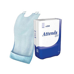 ATTENDS DISPOSABLE BIB REGULAR WITH TAPE (250's)Attends disposable bibs are a perfect solution to keeping clothes dry and free from spillages, with the addition of an effective liquid absorbent top sheet to quickly absorb any spillages.For maximum protection against liquid spillage, a waterproof polyethylene back sheet is included in the bib, and an additional pocket which can be turned inside out to reduce the risk of spills is also built into the bib.The bib comes with adhesive fixation tape on the shoulders which is designed to keep the bib in place and ensure maximum security so you won't have the worry of the bib falling off during use.In order to ensure maximum comfort during use, a low neckline is included in the pad to provide pleasant but secure fit.*Polythene waterproof back sheet (67x35cm).*Front pocket to reduce risk of spills.*Absorbent top sheet.