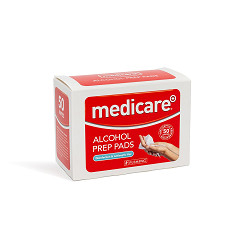 Medicare Alcohol Prep Pads are a great antiseptic source for topical cleansing and prepping skin prior to injections.These soft, absorbent, non-woven alcohol wipes provide rapid-acting skin preparation in a sterile formula. Each pad is impregnated with 99.9% isopropyl alcohol. The non-woven swabs are manufactured to the highest bacteriological standards.FEATURES¥ Non-woven pads impregnated with 99.9% Isopropyl alcohol ¥ Made from Biodegradable Crepe Paper¥ Sealed in a flexible foil sachet¥ Ideal for disinfection, antiseptic & topical microbial use ¥ Quantity: 50¥ Size: 16 x 10.5cmPrecautionary measures must be put in place in order to avoid infection. A simple prevention method to avoid contamination is to cleanse the skin prior to creating a break or puncture or making an incision in the skin. Cleaning the skin with alcohol prep pads prior to creating an opening is a small maneuver, but can prove to be a life-saving step in the prevention of infections.It is important, when purchasing and using alcohol prep pads, to be aware of their proper function. Unlike wound cleansers, alcohol prep pads should never be used on open cuts, scrapes and grazes. The alcohol content in prep pads is far greater than that of wound cleansers and is therefore far too high to use on broken skin. Their intended purpose is to clean the skin before inserting a needle or making a cut. By cleaning the skin prior to breaking it, germs on the skin's surface are cleared away. This means that there is less of a chance that they will get into the opening where they could potentially lead to infections. These are especially useful for patients who have to daily administer medicine via needle or do frequent skin prick tests, such as those with diabetes.In addition to sterilizing the skin, alcohol prep pads are also useful to have in first aid kits. They can be used to clean any piece of equipment which is used by more than one patient. This also helps to prevent patient to patient transfer of infection-causing viruses and bacteria. Our quality wound care treatment and dressings, and first aid supplies are designed using exceptional technology to improve the healing process.Medicare is a market leading health care brand, looking after all your needs in First Aid, Wound Care, and Sport Care. Our aim is to provide you with the most comprehensive range of products, of the highest quality and value for money. The extensive Medicare Wound Care range has been scientifically developed with your comfort in mind: from Wound Wash Spray, to Foam Dressing: whatever your Wound Care needs, we have the solution.